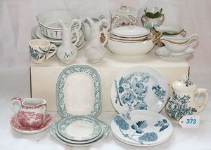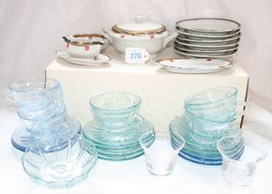 Porzellan-Speiseservice, Dekor etwas abgerieben, Terrine, Durchmesser 11 cm, 6 Teller, Sauciere, Schale und Platten, 2x Mokkaservice, Glas, 1x 6 Tassen, 1x 4 Tassen, mit Untertassen