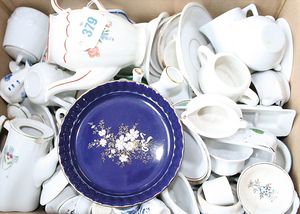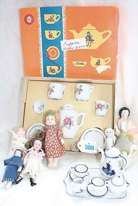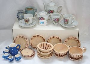 Konv. Puppenkeramik-Geschirr, ungem., dazu Puppen-Kaffee-Service, Porzellan, gem. 77, Kaffeekanne, Höhe 10 cm, mit 2 Tassen, Untertassen, Milchkännchen und Zuckerdose, kleiner Chip an einer Tasse