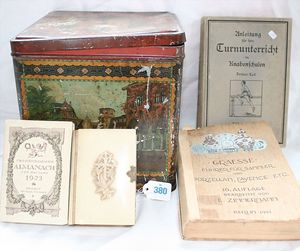alte Keksdose, altersbed. Farbabplatzer, Verformungen und kleine Risse im Deckel, Höhe 20 cm, dazu 3 Bücher, Anleitung für den Turnunterricht in Knabenschulen, 3. Teil von A. Maul, Graesse, Führer für Sammler von Porzellan, 16. Auflage Berlin 1922, Frauenzimmer Almanach für das Jahr 1923, dazu kleines Gebetsbuch in Bein gebunden