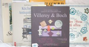 Konv. Fachliteratur, Küchenantiquitäten von Rudolph Maiolica, Villeroy & Boch, Trautes Heim, Glück allein, bestickte Sprüche für Haus & Küche von Eva Stille, Hörspielzeug von Antonia Frasa und So lebten die alten Puppen von Claire Hennig