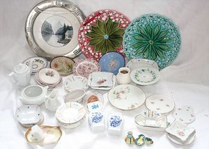 2 Keramik-Wandteller, florales Muster, gem. V.W.S., Durchm. 17 cm, 1 Keramikteller, Metall gefasst, Durchm. 19,5 cm, dazu Konv. Porzellan-Puppenstuben-Geschrirr, meist Einzelteile, Limoges, Rosenthal und anderes
