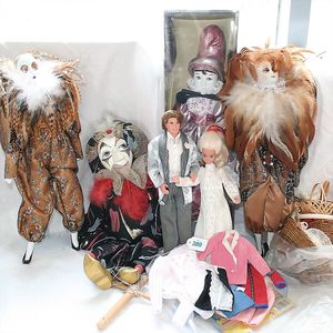 3 Porzellan-Puppen (Pierot), neu, Stoffkörper, Porzellan-Hände und -Füße, ca. 38 cm, dazu 1 Marionette, 43 cm, einige kleine Puppenkörbe, Babybürste, Beissring, Barbie und Ken, 90er Jahre mit einigen Kleidungsstücken