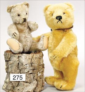 2 Celluloid-Puppen, 1x Körper gemarkt Celba 46/45, blaue Schlafaugen, off. Mund, 2 Zähne oben, Echthaarperücke aufgeklebt, 1x K&W 32/36 blaue Schelmenaugen, geschl. Mund, Echthaarperücke, Körper wohl nachträgl. ergänzt, 37 cm