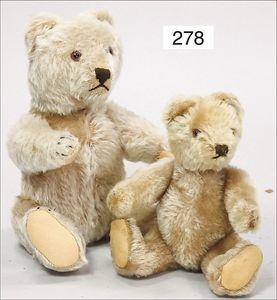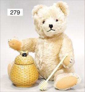 Bär, Hersteller ?, Baumwollplüsch, Filztatzen etwas aufgegangen, 29 cm, dazu 1 alter Koffer mit Holz- und Metallbeschlägen, L: 84 cm, H: 32 cm, T: 46 cm