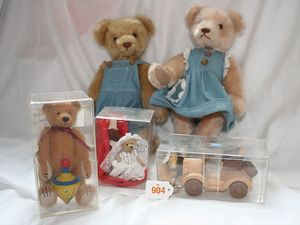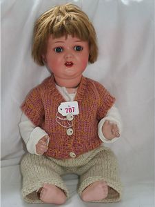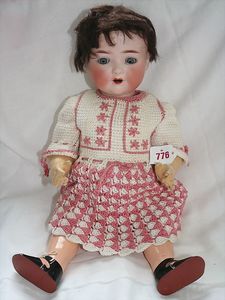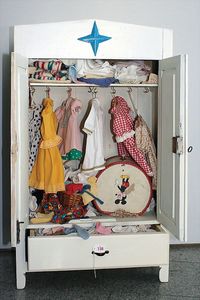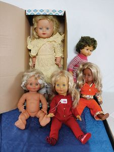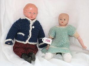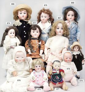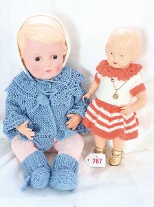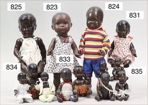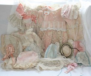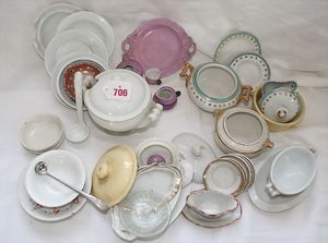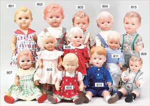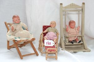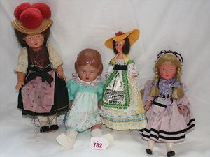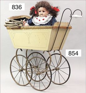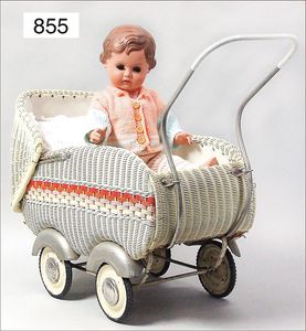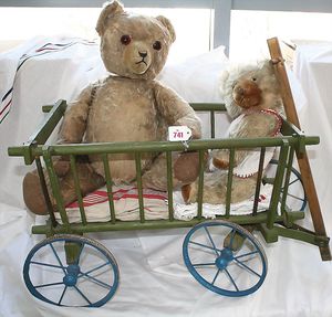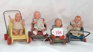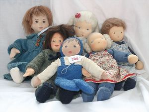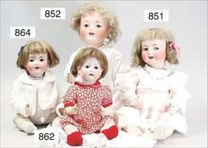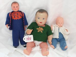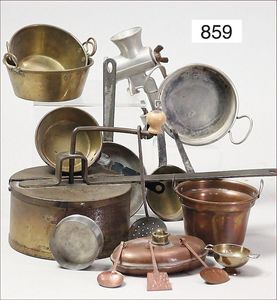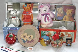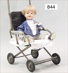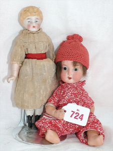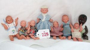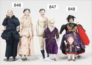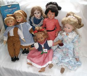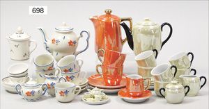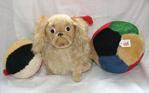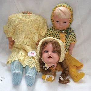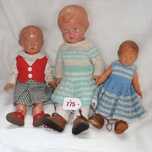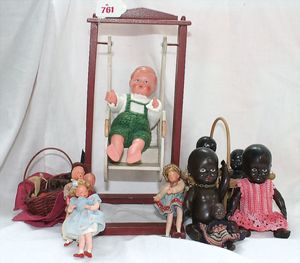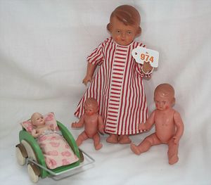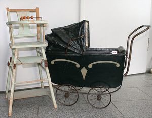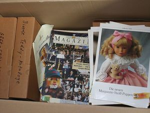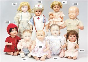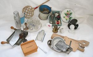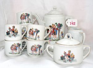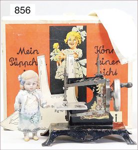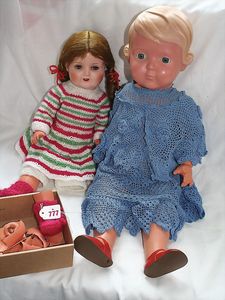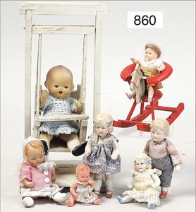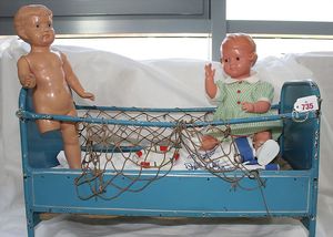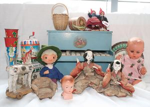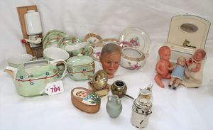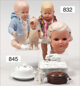 Fundkiste, u.a. Puppenkaffee-Service, Porzellan, Kaffeekanne, Höhe 8 cm, mit 6 Tassen, Untertassen, Milchkännchen und Zuckerdose, Griff an einer Tasse weggebrochen, dazu Suppenterrine, mit Platte, 2 Schüsseln, 2 Teller, 1 Wandkaffee-Mühle, Verschluss fehlt, 1 Blech-Waschtisch, Höhe 14 cm, 3 Celluloid-Püppchen, 1 Masse-Einbindekopf-Vollkopfjunge, modellierte Frisur, gem. 803 und anderes