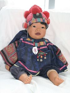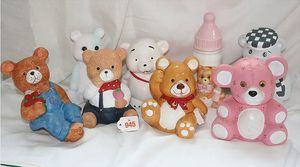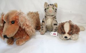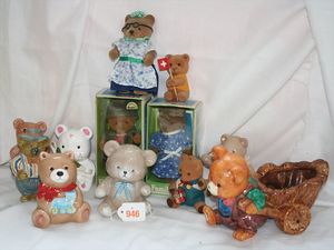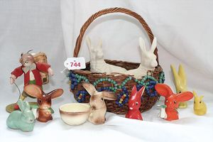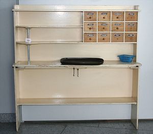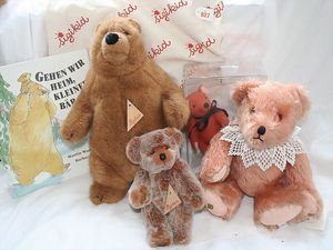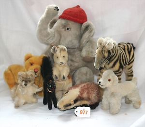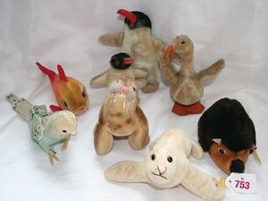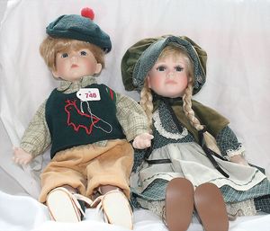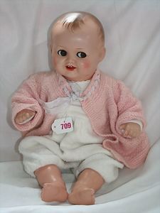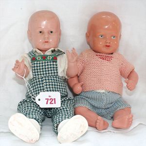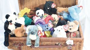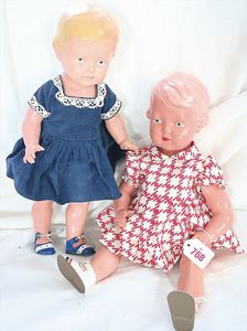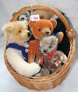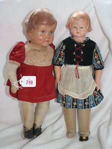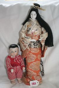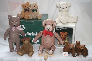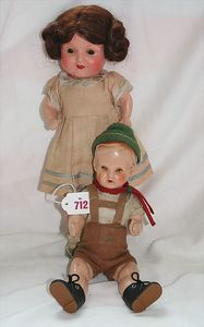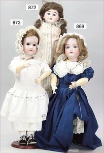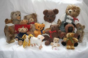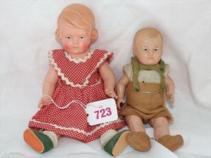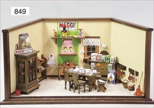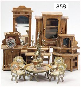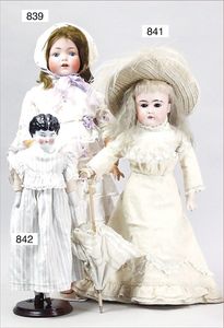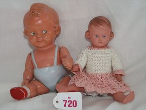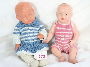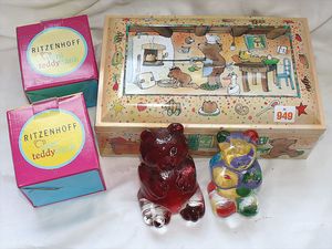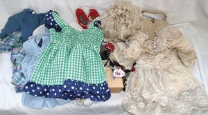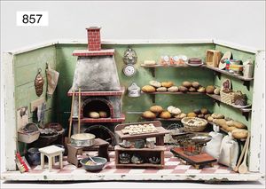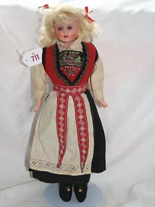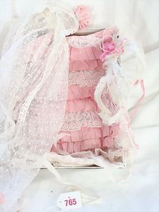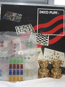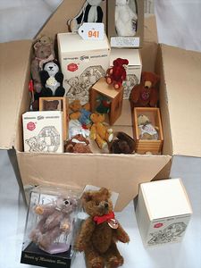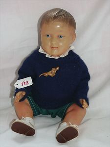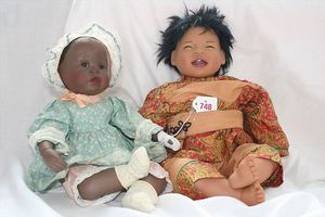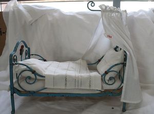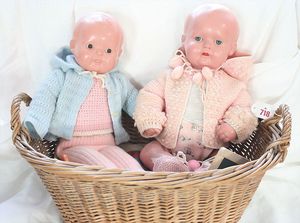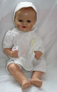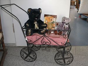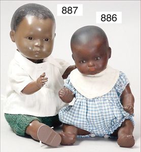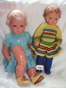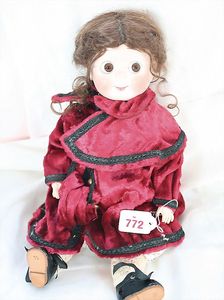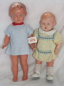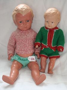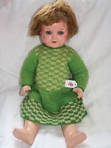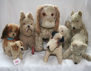 Fundkiste, u.a. Puppenkaffee-Service, Porzellan, Kaffeekanne, Höhe 8 cm, mit 6 Tassen, Untertassen, Milchkännchen und Zuckerdose, Griff an einer Tasse weggebrochen, dazu Suppenterrine, mit Platte, 2 Schüsseln, 2 Teller, 1 Wandkaffee-Mühle, Verschluss fehlt, 1 Blech-Waschtisch, Höhe 14 cm, 3 Celluloid-Püppchen, 1 Masse-Einbindekopf-Vollkopfjunge, modellierte Frisur, gem. 803 und anderes