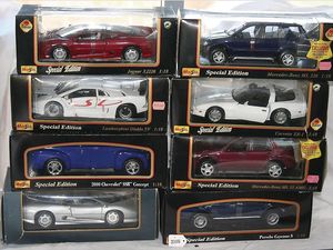 Konv. 10 Modellfahrzeuge, Maßstab 1:18, versch. Hersteller u.a. Maisto, meist Porsche und Mercedes CLK, unbespielt, im Orig.-Karton