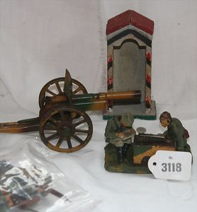 Konv. Blech, Maschienengewehrschütze, lithogr., 12 cm, Mechanik defekt, sonst gut, Märklinkanone, Zwillingsrad, Tipco Scheinwerfer, ohne Glas, Kanone Mimikri, bespielt, Kleinteile fehlen