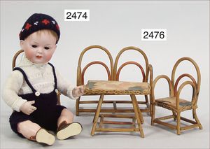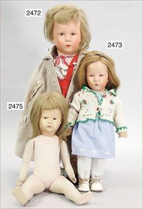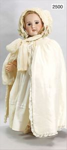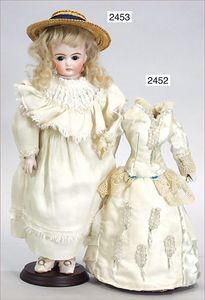 wohl KESTNER 167-1, Biskuitporzellan-Brustblattkopf-Puppe, Mohairperücke, eingesetzte Glasaugen, Augenmechanismus lose, geschl. Mund, Kinngrübchen, Lederkörper mit Porzellanunterarmen, Finger an 1 Hand bestoßen, alte Unterkleidung und Schuhe, 32 cm