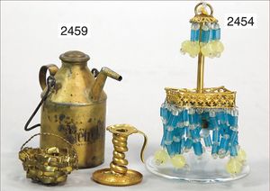 Puppenstuben-Ausschmückungsteile, Petroleumkanne, Blech lackiert, 6,5 cm, Lackfehler, kl. Leuchter, Erhard & Söhne, Messingblech vergoldet, kl. Korb Messingblech vergoldet