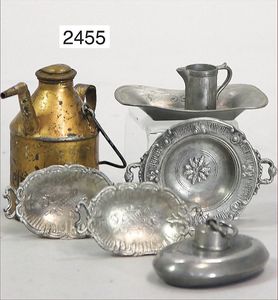 Puppenstuben-Ausschmückungsteile, Petroleumkanne, Blech lackiert, 9 cm, kl. Zinn-Bettflasche, einige Schalen