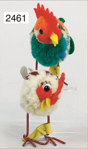STEIFF 2 Woll-Miniaturen, Henne & Hahn, Nomotta-Wolle, Hahn mit Filzschnabel sowie -kamm und grünem Gefieder, Metallbeine, mit Knopf und gelber Fahne, Nr. 1508.47, Fahne in gutem Zustand, dazu Henne mit Filzschnabel und -kamm, drehbarer Kopf, Filzgefieder, mit Knopf und gelber Fahne, leider unleserlich, beide 6 cm, guter Zust.