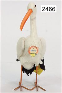 STEIFF Adebar, mit Knopf, Schild und Fahne, Nr. 1017.00, Metallbeine, Schnabel in gutem Zust., Stehhöhe 17 cm, Filzgefieder gut