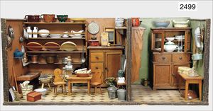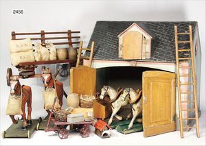 Stall, ca. 1860, 63 cm breit, 62 cm hoch, Orig.-Bemalung, vorne Türen zum Öffnen, seitlich aufgemalte Fenster, 4 Zugpferde, Leiterwagen mit Zubehör, aus Museumsauflösung