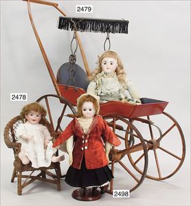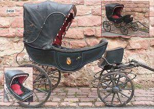 herrschaftl. Kinderkutsche, um 1800, aus höfischem Haushalt, Kutsche wurde damals von 1 Ziegenbock oder vom Gärtner persönlich gezogen, 1,40 m ohne Deichsel gerechnet, Speichenräder, geschmiedete Blattfedern, Orig.-Verdeck, Orig.-Zust., Verdeck altersbed. an ein paar Stellen eingerissen, schöne Dekoration für große frühe Puppen, museal