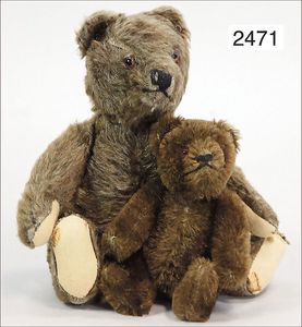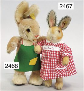 STEIFF Pupp-Hase, Plüschkopf, filzunterlegte Ohren, Reste der gelben Fahne mit Roststellen, Stoffkörper in gutem Zust., Stehkörper, Schlenkerarme, wohl Originalzeit, mit Ohren 27 cm