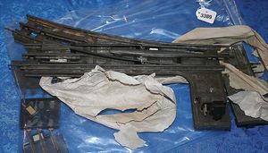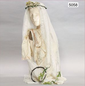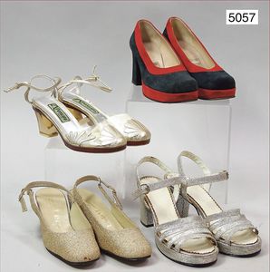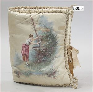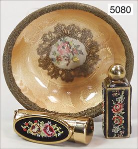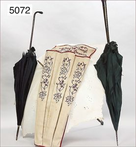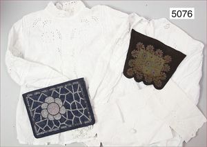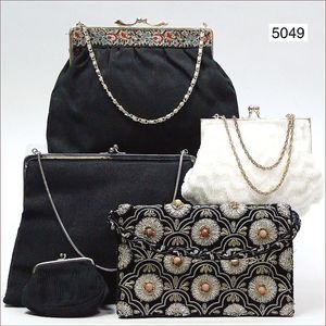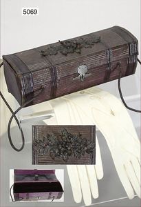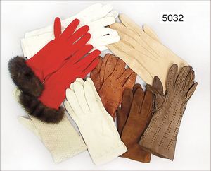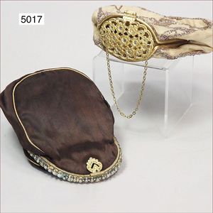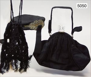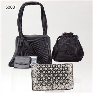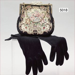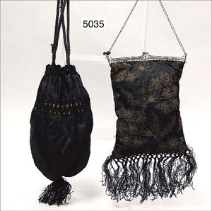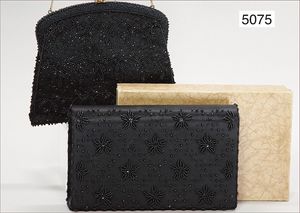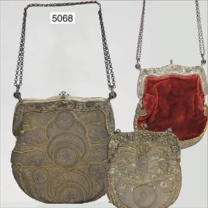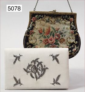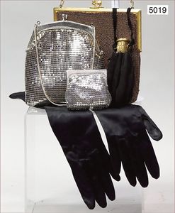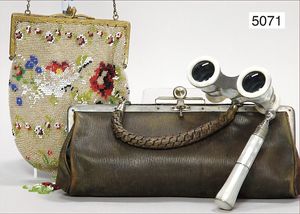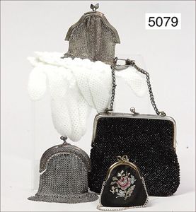 Konv. Damen-Abendhandtaschen, feine perlenbestickte Damentasche, goldener Bügel, innen cognacfarbene Seide, Seitentasche, 1 Kettentrageriemen wohl neuer, 17 cm hoch, 17 cm breit, unberührter Zust., dazu silberne Abendtasche, Kettenstoff, Innenfutter weiße Seide, dazu passendes Portemonnaie, Seitentasche 16 cm hoch, 15 cm breit, Metall-Trageriemen, dazu kleine Biedermeier-Beuteltasche, Messingblech vergoldeter Verschluss, florales Muster auf dem Deckel, schwarzer Lederbeutel, minim. verschlissen, ausgefallen, 11 cm hoch, dazu 1 Paar schwarze Seidenhandschuhe, schönes Konv.