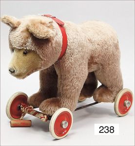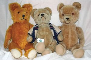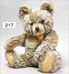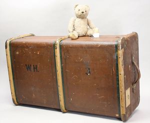 Bär, Hersteller ?, Baumwollplüsch, Filztatzen etwas aufgegangen, 29 cm, dazu 1 alter Koffer mit Holz- und Metallbeschlägen, L: 84 cm, H: 32 cm, T: 46 cm