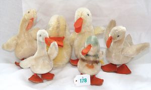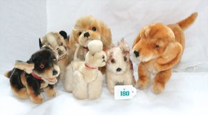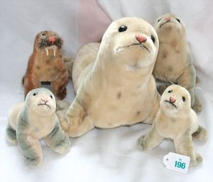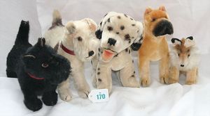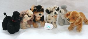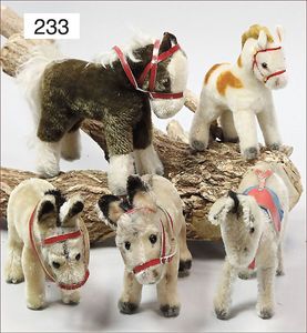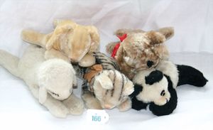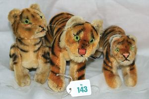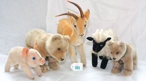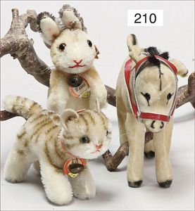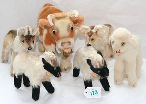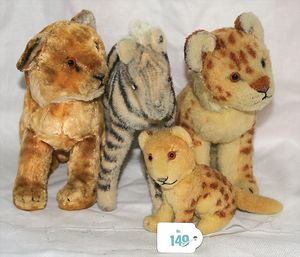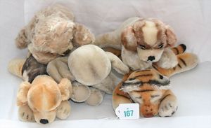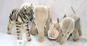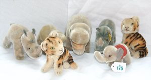 STEIFF Konv. 7 Tiere, 6x ohne Knopf, Schild und Fahne, Nilpferd, Nashorn, kleiner Elefant, 2x Tiger, sitzend, bewegl. Kopf, Höhe 10 cm, und 1 Nosy mit Knopf, Schild und Fahne, Nr.1100.10