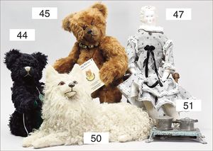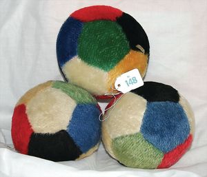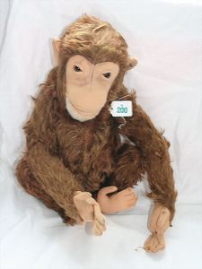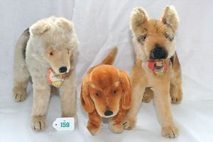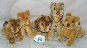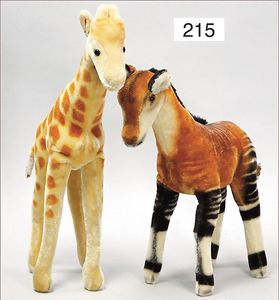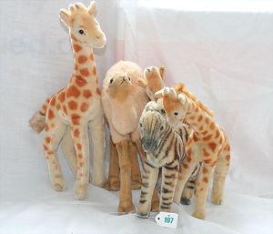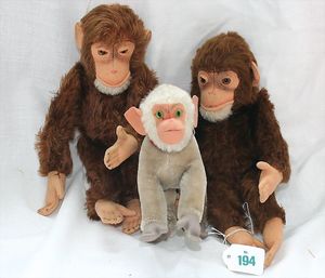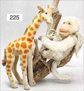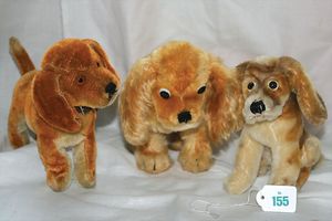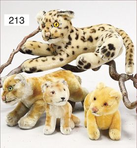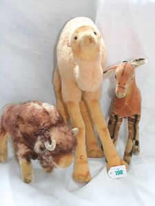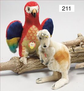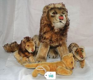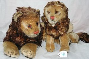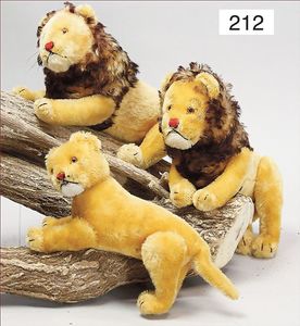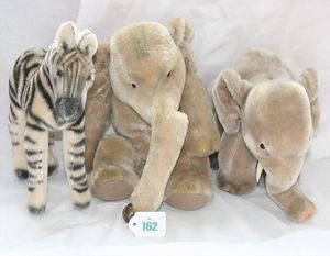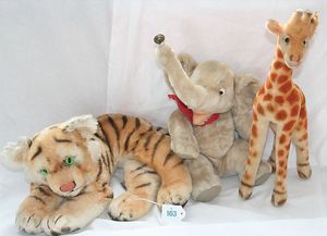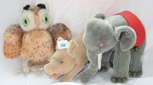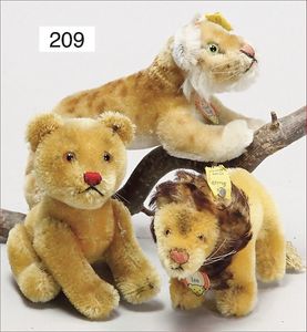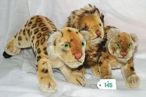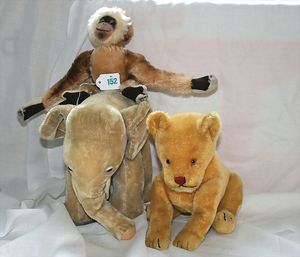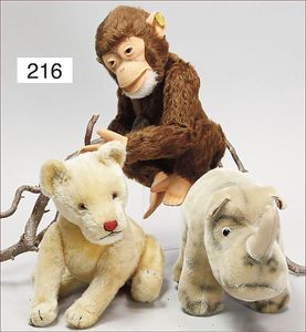STEIFF 3 Teile, 1 Jocko, mit Knopf und Fahne, sitzend, ca. 25 cm, 1 Nashorn ohne Knopf, Schild und Fahne, 28 cm, 1 Löwe, mit Knopf, gegliedert, Kopf drehbar, ca. 25 cm
