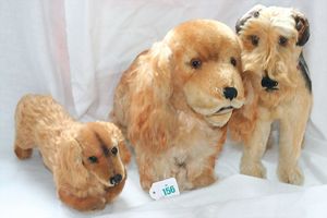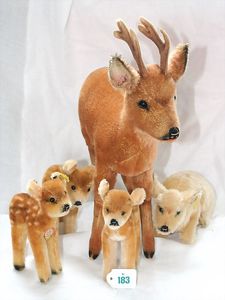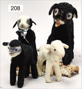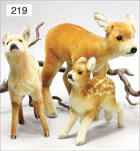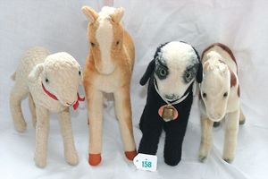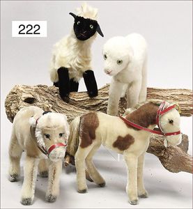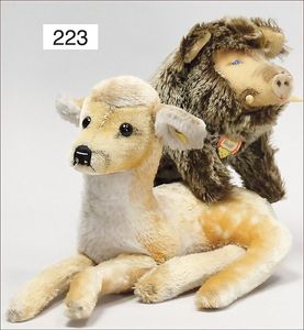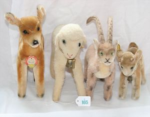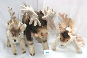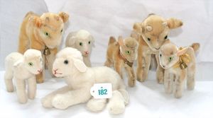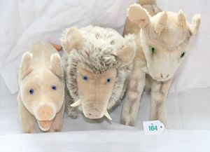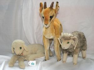 STEIFF 3 Teile, 1x Lamm, liegend mit Schild, ca. 24 cm, 1x Widder, ohne Knopf, Schild und Fahne, 22 cm, und 1x Antilope, mit Knopf und Fahne, Nr. 1335,00, Stehhöhe ca. 30 cm