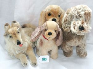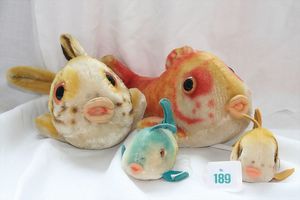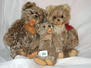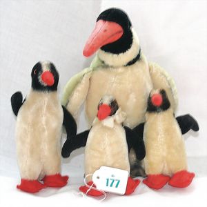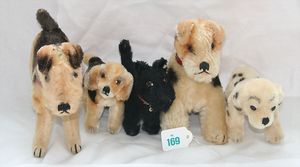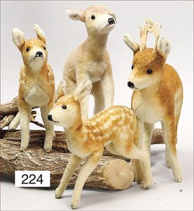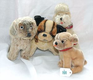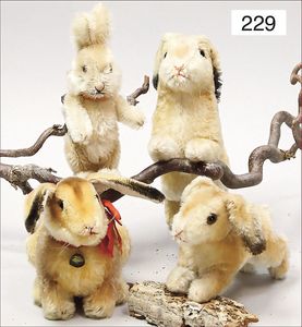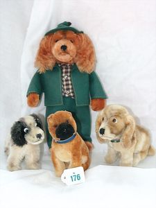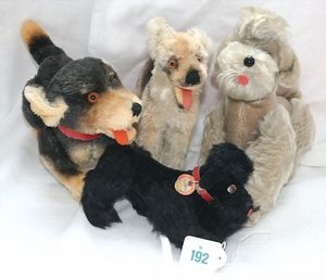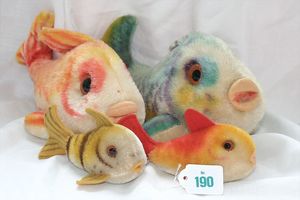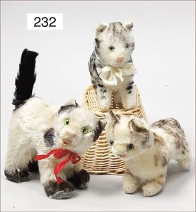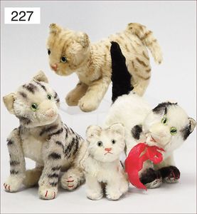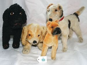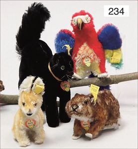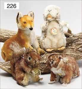 STEIFF 4 Teile, 1x Piff, mit Schild, 18 cm, 1x Fuchs mit Knopf, Länge 20 cm, 1x Nurmy, mit Knopf, Schild und Fahne, Nr. 2314.00 und 1x Eichhörnchen mit Nuss, Knopf und Fahne, 12 cm