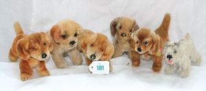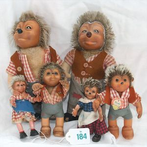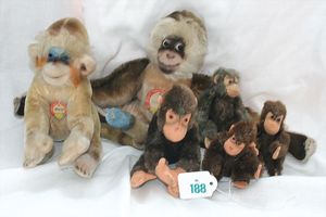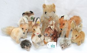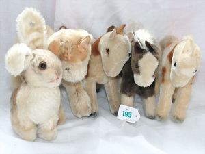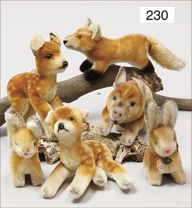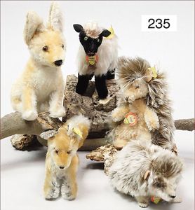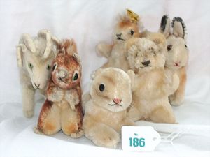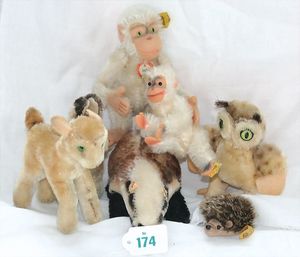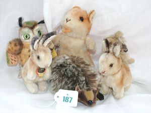 STEIFF Konv. 6 Kleintiere, bespielt, teilw. mit Knopf und Fahne, 2x Manni-Hase, ca. 8 cm, Eule, gemarkt 4310, Igel gemarkt 2310/00, kl. Xorry, 1 Hamster, mit Knopf, 12 cm