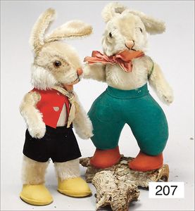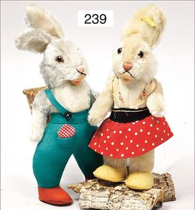 STEIFF Hasenpärchen, 1 Hasenjunge, ohne Knopf, Schild und Fahne, Made in U.S. Zone, 21 cm, drehbarer Kopf, Kiepe, grüne Filzhose, 1 Hasenmädchen, mit Knopf und Fahne, Filzschuhe, Stoffrock