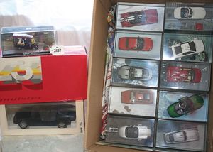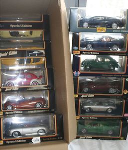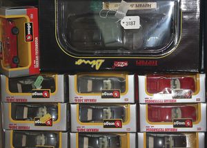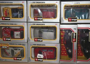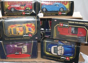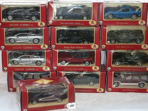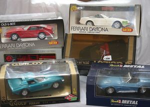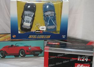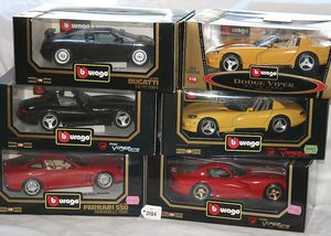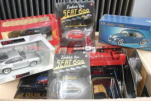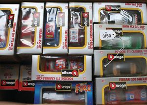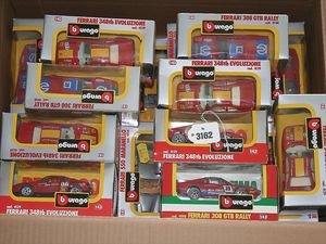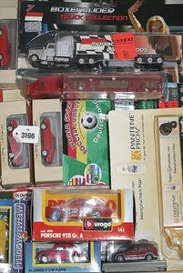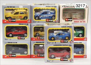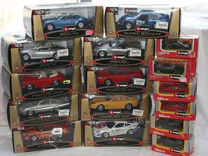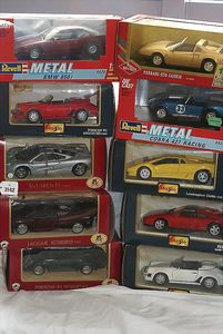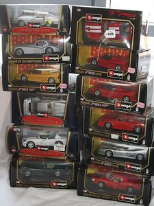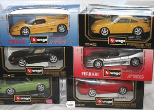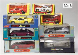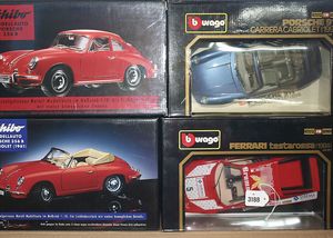 Konv. 12 Modellfahrzeuge, Maßstab 1:18, davon 10x Marke Burago, meist Ferrari, Porsche und Lancia, dazu 2 Tchibo-Modell-Fahrzeuge Porsche 356, unbespielt, im Orig.-Karton