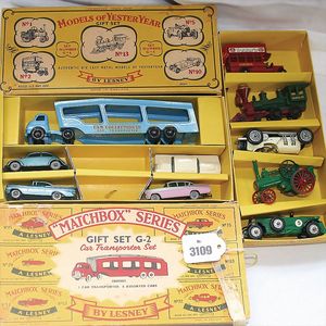 MATCHBOX Gift-Set G2 Cartransporter, 5 von 7 Fahrzeugen, teils sehr guter Zust., teils leicht bespielt, Orig.-Kart. teils verschlissen, mit Einrissstellen, Modells of Yesteryear G6, 5 Fahrzeuge im Orig.-Kart., Karton am Rand verschlissen, Fahrzeuge meist sehr guter Zust.