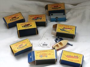 MATCHBOX Lesley Nutzfahrzeuge, 1 Boot Nr. 8, 24, 16, 30, 13, 48, 3, 74, guter bis sehr guter Zust., im Orig.-Karton, Kartons teilweise verschlissen, sowie Seitenlaschen fehlen