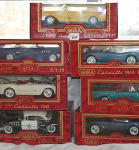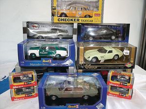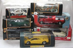 Konv. 7 Modellfahrzeuge, versch. Hersteller und Modelle, darunter Ertl, Burago und Paul´s Modellart, 2x 1:24 und 4x 1:18, alle unbespielt, im Orig.-Karton