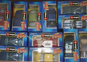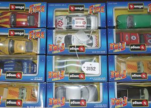 Konv. 13 Modellfahrzeuge, darunter 12x Burago, Maßstab 1:43, 6x in 5er bzw. 4x in 2er-Schachteln, dazu 3x Modell von GuiToy, Maßstab 1:33, unbespielt, im Orig.-Karton