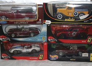 Konv. 10 Modellfahrzeuge, Maßstab 1:18, versch. Modelle, 7x Hot Wheels, meist Ferrari, 1x Solido, Ford Pick Up und 2x Fa. Road Legends, unbespielt, im Orig.-Karton