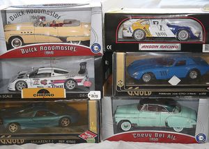 Konv. 6 Modellfahrzeuge, Maßstab 1:18, versch. Hersteller und Modelle, darunter Audi R8 Le Mans, Chevrolet Impala u.a., alle unbespielt, im Orig.-Karton