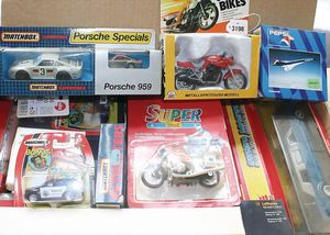 Konv. 51 Modellfahrzeuge, versch. Hersteller, darunter 26x PKW in versch. Gr., 16 Motorräder, 1 Fahrrad Maßstab 1:18 und 8 Flugzeugmodelle der Fa. Herpa, alles unbespielt, im Orig.-Karton