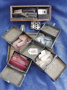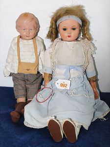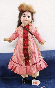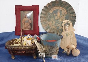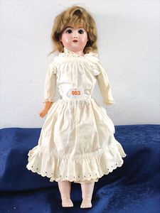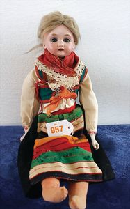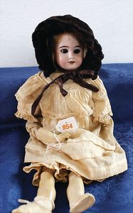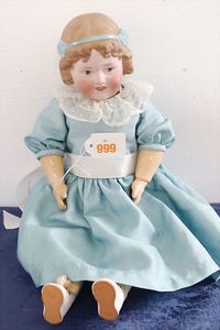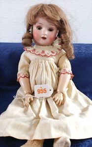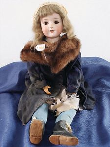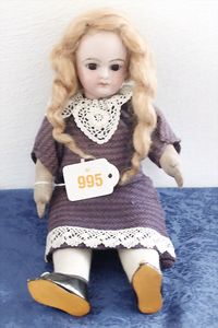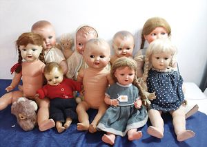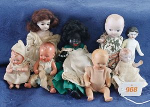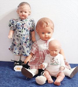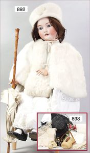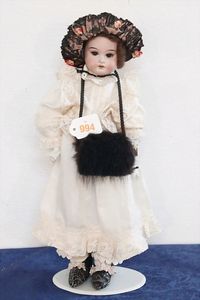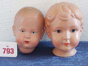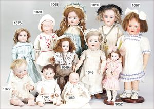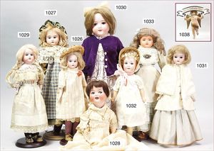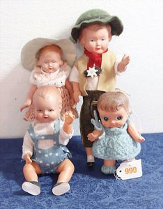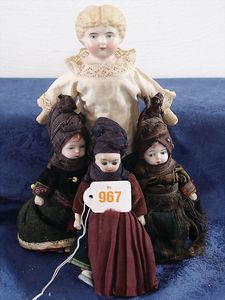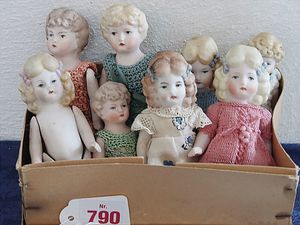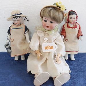 3 kl. Porzellan-Puppen, 1 x Gebr. Kühnlenz, fest eingesetzte Glasaugen, off. Mund, Zähne, Echthaarperücke, Masse-Stehkörper, 15 cm, 1 x gemarkt 155/5, braune Schlafaugen, off. Mund, Zähne, Mohairperücke, Masse-Stehkörper, 18 cm, 1 x gemarkt Germany 390, braune fest eingesetzte Glasaugen, Mohairperücke, Masse-Stehkörper, alle mit anmodellierten Schuhen u. Strümpfen, 15 cm