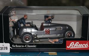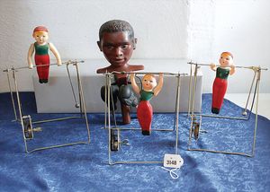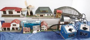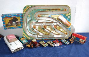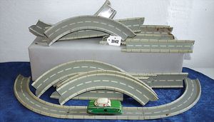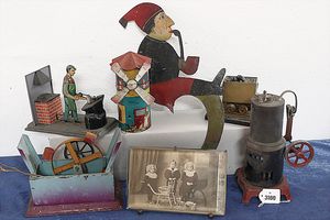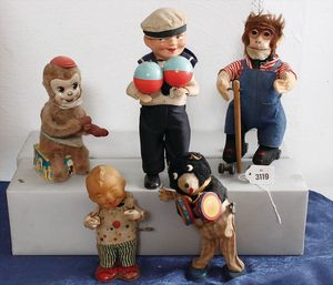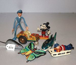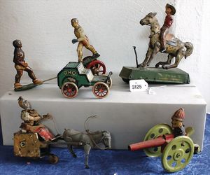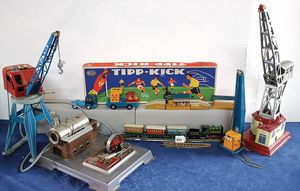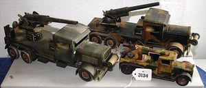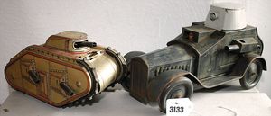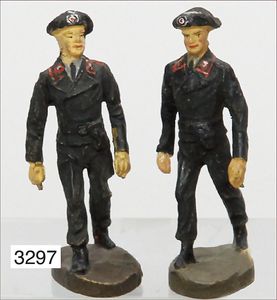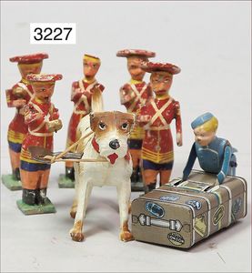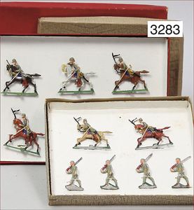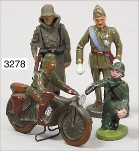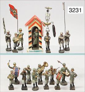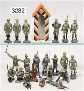 12 Teile Elastolin, 2. Weltkrieg, Masse, 7,5 cm, marschierend, dazu 13 Teile ungem., 1 Gleitwerk, TippCo, mit Emblem, meist Zust. 2-3, 3 Figuren Elastolin, stillgestanden, 1 General, Lineaol, 4 Figuren kämpfend, 1 Wärterhaus, 1 paar Teile beschädigt