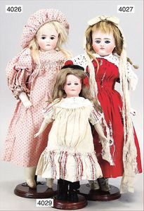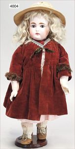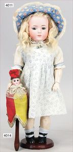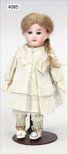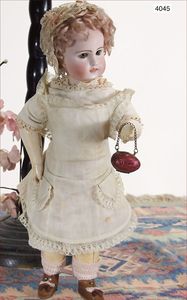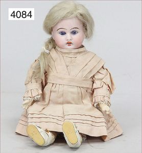 KESTNER 143 Biskuit-Porzellankopfpuppe, 51 cm, Kurbelkopf, blaue Schlafaugen, off. Mund, oben Zähne, Gipsdeckel wurde nicht entfernt, (Transportrisiko für Augenmechanismus beachten), alte Mohairperücke etwas ausgegangen, Gliderkörper, alte Unterkleidung, Schuhe und Strümpfe