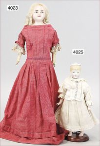 JUMEAU frühe Primére Jumeau, 1. Serie, franz. Bébé, Biskuitporzellan-Kurbelkopf-Puppe, gem. Nr. 6, große Anzahl an ausgefallener alter passender Kleider, blaue, fest eingesetzte Strahlenaugen, geschl. Mund, durchst. Ohren, sehr helles Porzellan, fein schattierte Augenlider, franz. Gliederkörper, frühe ausmodellierte Hände, mit festen Handgelenken, 8 lose Kugeln, sehr schöner Zust., alter Korkdeckel, blonde, lockige unberührte Mohairperücke, alte schöne Kleidung u. Unterkleidung, lilafarben mit mintfarbener Seide, schöner Orig.-Zust., Kleid absolut unberührt und orig., alte orig.-Jumeau Schuhe, 40 cm, dazu kl. Eiertasche, Leder, innen mit Häkelutensilien, blaue Seide, ausgefallen, absolutes Spitzenstück, extrem selten