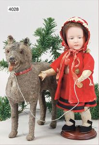HEUBACH Sonne 6869, Biskuitporzellan-Charakter-Puppe, 28 cm, Biskuitkurbelkopf, blaue Intaglioaugen, Toddlerkörper mit festen handgelenken, außergewöhnliche Handstellung, gekleidet als Rotkäppchen, dazu passender Papiermaschee Wolf