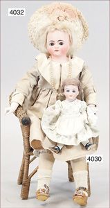 Biskuitporzellankopf-Puppe, wohl Simon & Halbig, 18,5 cm, braune Schlafaugen, off. Mund, oben Zähne, Masse-Stehkörper, mit anmodellierten Schuhen u. Strümpfen, Orig.-Kleidung gehäkelt, Orig.-perücke wurde nicht entfernt, von außen keine Risse erkennbar, Transportrisiko für Augenmechanismus beachten, dazu passend kl. Keramik-Hund, 8 cm