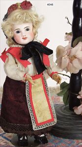 HERMANN STEINER Made in Germany, Gr. 5, Biskuitporzellankopf-Puppe, 32 cm, braune Schlafaugen, Puppe hat einen leichten Silberblick, off. Mund, oben Zähne, Kinngrübchen, Masse-Stehkörper, Orig.-Trachtenkleidung, Orig.-Perücke