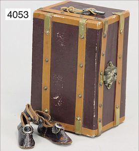 Trousseau, geeignet für franz. Bebe, lila/braun, Tragehenkel seitl., mit Orig.-Schlüssel f. Schloß, innen rosafarbenes Papier beklebt, 15 cm breit, 8 cm hoch, 10 cm tief, dazu 1 Paar Puppenschuhe, Gr. 4, farbl. Dazu passend, Sohle an 1 Schuhe etwas abstehend, schönes Beistellwerk