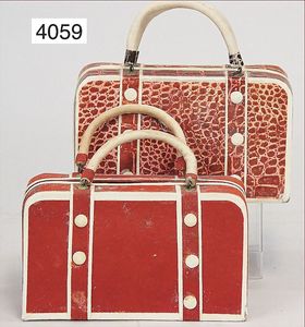 Konv. 2 Reisekoffer, Papiermaché, mit bunt lithogr. Papier beklebt, mit 2 Trageriemen, 11,5 cm breit, 7 cm tief, 7 cm hoch, beide in schönem Zust., mit Stoffresten gefüllt