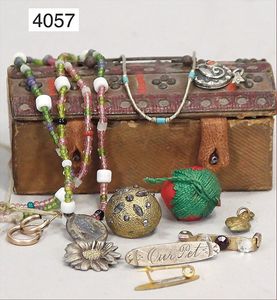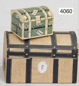 Konv. 2 Trousseaus, 1 x Papiermaché Trousseau, mit lithogr. Papier beklebt, 10,5 cm breit, 6 cm hoch, Unterseite Aufschrift Made in Germany, mit doppeltem Boden und kl. Stoffresten, dazu 1 kl. Trousseau mit bunt lithogr. Papier beklebt, gemarkt Germany, 5 cm breit