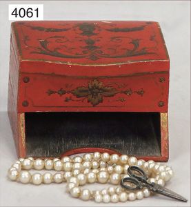 früher Nachttisch, Holz,, rot lackiert, mit goldenen Verzierungen, zum Aufklappen, 6,5 cm breit, 4 cm hoch, mit Perlenhalskette, ausgefallen