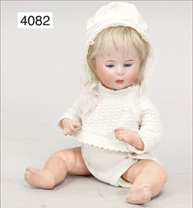 HERTEL, SCHWAB & CO Biskuitporzellan-Charakterpuppe, gemarkt 152, 21 cm, Kurbelkopf, blaue Schlafaugen, off.-geschl. Mund, stämmiger Stehkörper, beweglichen Armen und Beinen, Kopf passt nicht ganz in die Halspfanne, Riss seitlich, Perücke wurde nicht entfernt, (Transportrisiko für Augenmechanismus beachten)