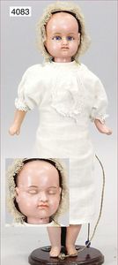 Zwei-Gesichterpuppe, Papiermaché, Wachs überzogen, fest eingesetzte Glasaugen, schlafend gemalte Augen, Zugstimme u. Zugdrehmechanismus, Stoffkörper, Masse-Arme u. –Beine, guter Zust., 38 cm
