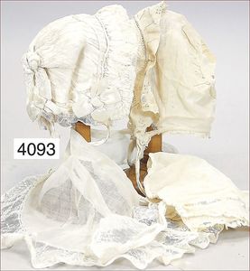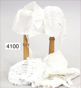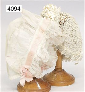 Konv. franz. Puppenhäubchen, 1 x Spitzenhaube, innen mit weißem Seidenbesatz, zarte rosé farbene Seidenschleife, 12 cm, sehr schöner Orig.-Zust., dazu 1 gehäkelte Haube, 1 x franz. transparentes Häubchen, mit Spitzen- u. Seidenbesatz, dazu passend transparentes Spitzenhemdchen, sehr schönes Konv.